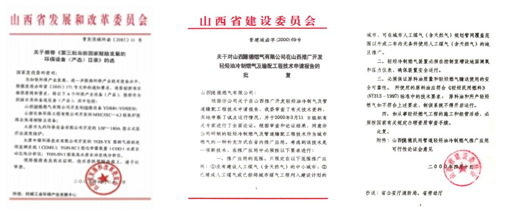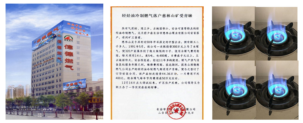 輕烴冷制燃氣,1993年前研究的也是加溫制氣,做了107戶供氣,輕烴加溫36度以上就產(chǎn)氣,天氣冷,每天多次排殘液、管道每天排3~5(水)桶凝液(輕烴),火勢不穩(wěn),也威脅安全,準備放棄改煤氣;國務(wù)院要求發(fā)展油制氣,研究不加溫試試,根據(jù)汽車用水降溫,摩托車用風(fēng)降溫不拉缸原理啟示,不兌任何添加劑,將輕烴完全汽化,解決了殘液、凝液問題,專門改裝了1梯6戶,室外明管不保溫,在零下23度沒有凝液,經(jīng)完善達到了供氣穩(wěn)定的目的,承建了多個小區(qū),常溫低壓供氣,使用穩(wěn)定,找不到任何缺點;于2003~2005年八次向黨中央,國務(wù)院、有關(guān)部委報《喜報》:得到了大力支持,定為《國家鼓勵發(fā)展的資源節(jié)約綜合利用和環(huán)境保護技術(shù)項目》、《免稅項目》和《城市燃氣》。